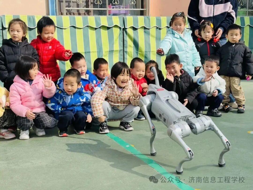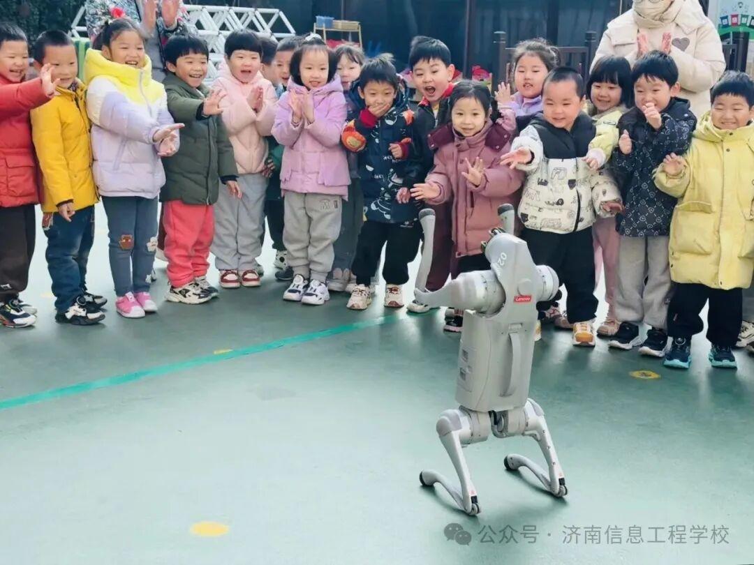 在智能机器狗互动环节,学校带来的智能机器狗成为最受孩子们欢迎的“科技伙伴”。在师生的专业操控下,机器狗精准完成翻身、跳跃、奔跑、作揖等灵动的仿生动作,流畅的表演引得孩子们欢呼声、掌声不断。孩子们围坐观察、踊跃互动,在近距离接触中直观感受人工智能的魅力,师生们还用通俗易懂的语言讲解AI原理,为孩子们播撒下科技启蒙的种子。