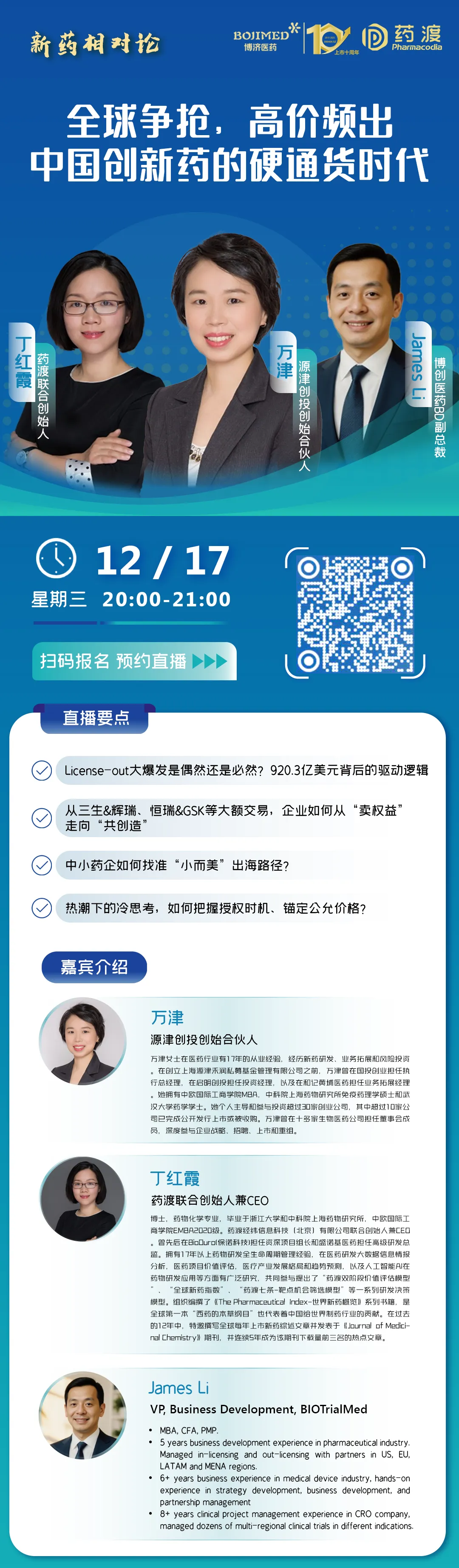12月17日(下周三),药渡与博济医药联合打造的《新药相对论》直播专场,将直面这些核心议题。本期特邀源津创投创始合伙人万津、博济医药北美子公司BIOTrialMed BD副总裁James Li及药渡联合创始人丁红霞,共同穿透交易数据的热潮,探讨中国创新药价值全球化兑现的核心动能与未来航向。