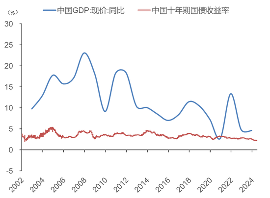 但我国在2021年之前,十年期国债收益率与名义GDP增速之间存在巨大缺口,说明过去我国的利率水平长期偏低。原因很简单:利率是管控的,偏低的利率水平有利于投资,故中国长期的经济增长模式就是投资拉动。